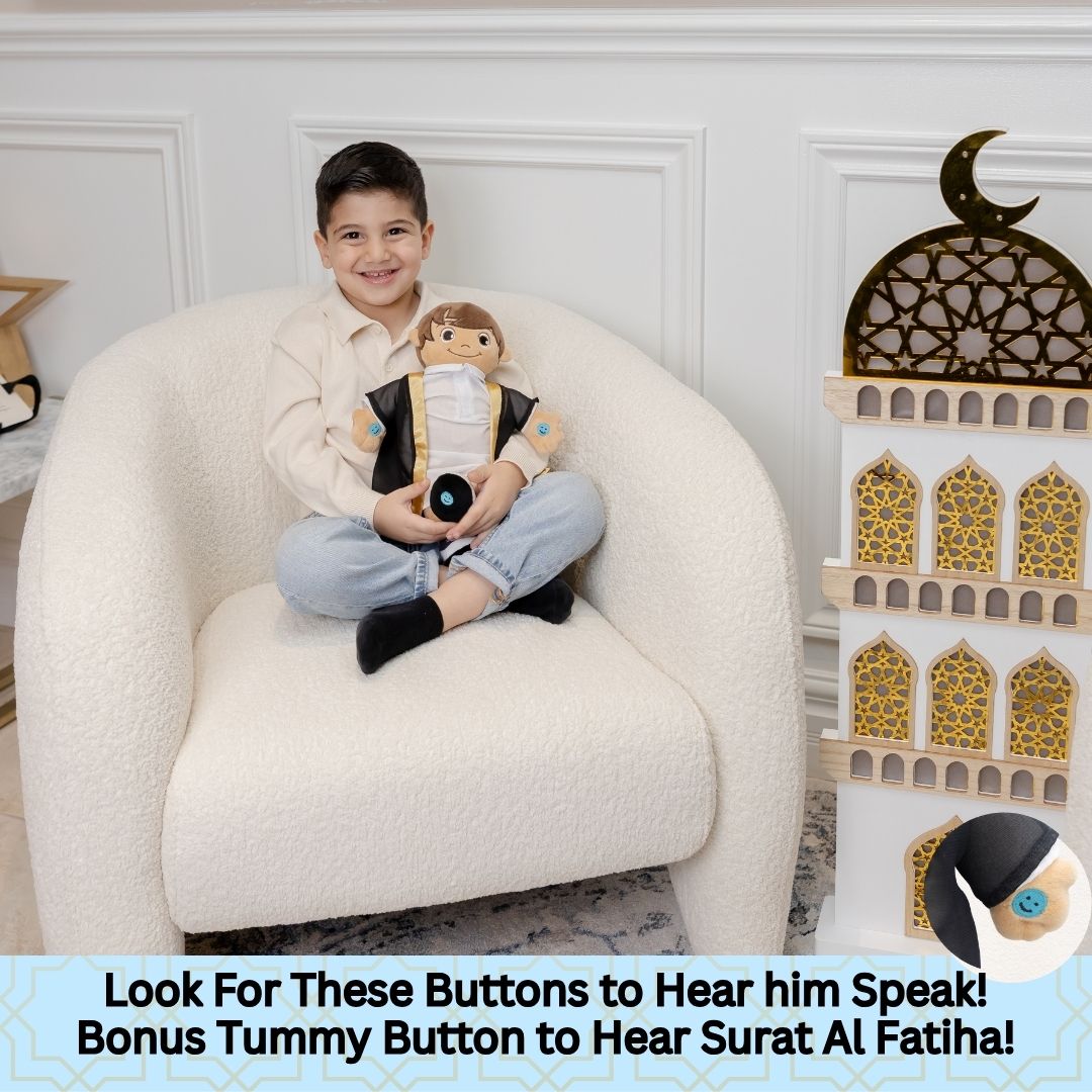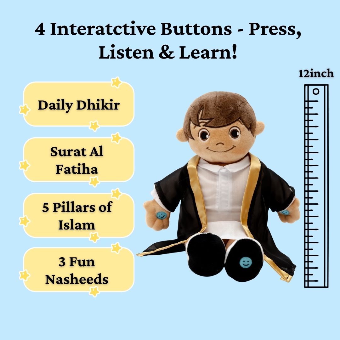 Dites Salam à Khaled , la poupée parlante et câline qui rend l'apprentissage de l'islam amusant, engageant et interactif ! Conçue pour les jeunes cœurs, Khaled présente aux enfants la beauté des enseignements islamiques d'une manière qu'ils adoreront.